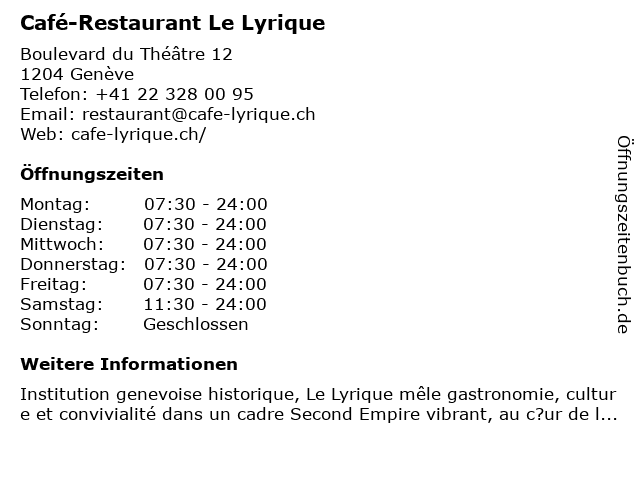 | Öffnungszeiten Café-Restaurant Le Lyrique in Genève anzeigen | |