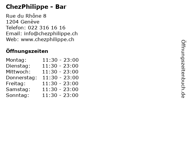 | Öffnungszeiten ChezPhilippe - Bar in Genève anzeigen | |