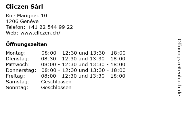 | Öffnungszeiten Cliczen Sàrl in Genève anzeigen | |