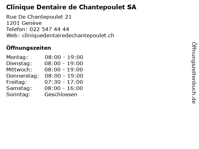 Branchen & Suchbegriffe zu Clinique Dentaire de Chantepoulet SA:chantepoulet, clinique, de, dentaire, dentalhygieniker, kieferorthopädie, kosmetische zahnbehandlung, parodontologie für zahnimplantate, sa, zahnersatz |