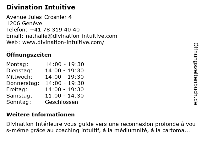 | Öffnungszeiten Divination Intuitive in Genève anzeigen | |
