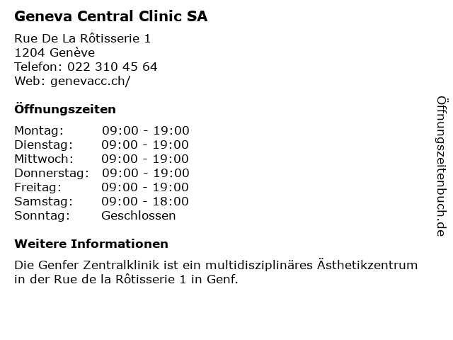 | Öffnungszeiten Geneva Central Clinic SA in Genève anzeigen | |