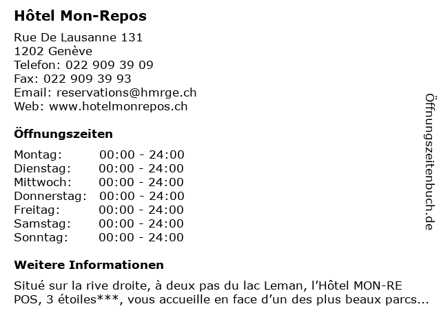 | Öffnungszeiten Hôtel Mon-Repos in Genève anzeigen | |