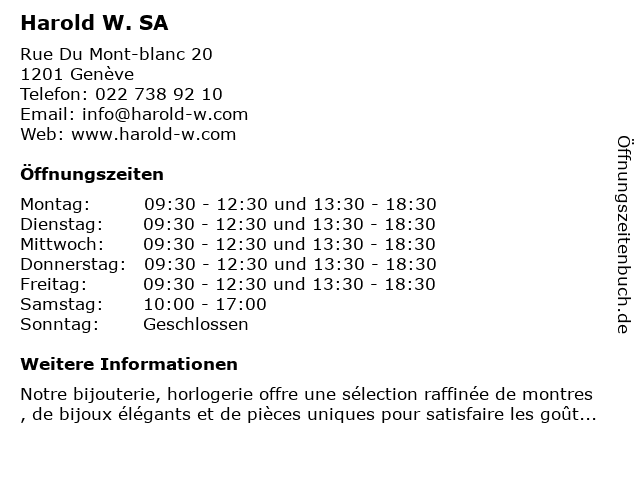 | Öffnungszeiten Harold W. SA in Genève anzeigen | |