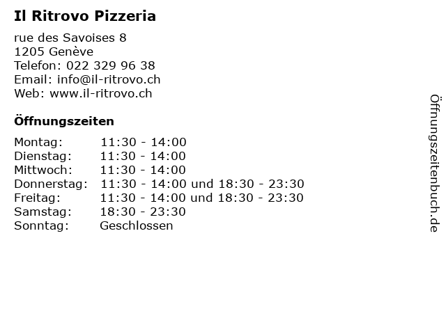 | Öffnungszeiten Il Ritrovo Pizzeria in Genève anzeigen | |