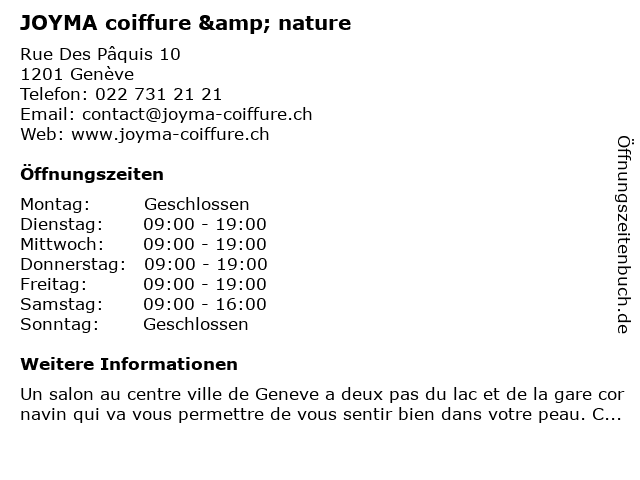 | Öffnungszeiten JOYMA coiffure & nature in Genève anzeigen | |