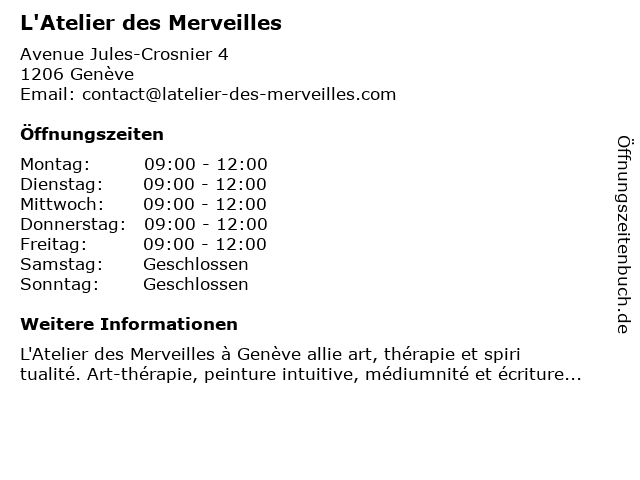 | Öffnungszeiten L'Atelier des Merveilles in Genève anzeigen | |