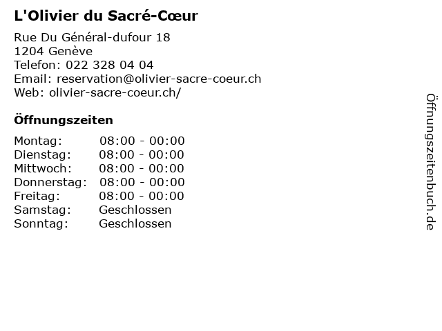 | Öffnungszeiten L'Olivier du Sacré-Cœur in Genève anzeigen | |
