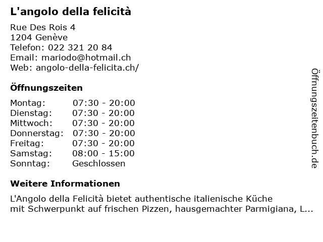 | Öffnungszeiten L'angolo della felicità in Genève anzeigen | |