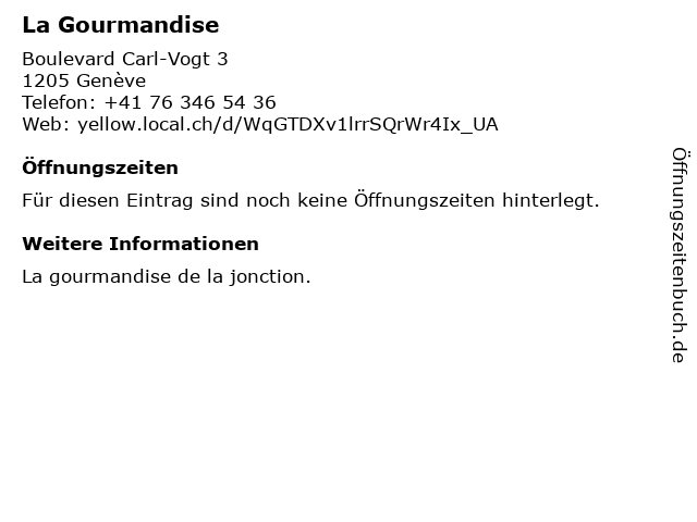 | Öffnungszeiten La Gourmandise in Genève anzeigen | |