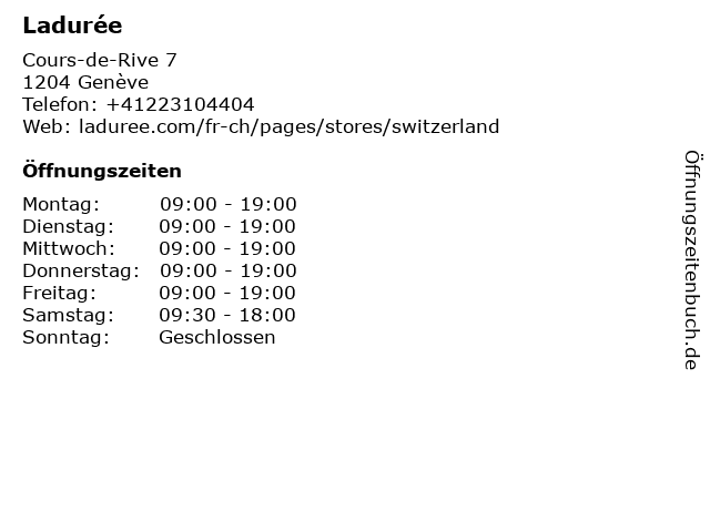 | Öffnungszeiten Ladurée in Genève anzeigen | |