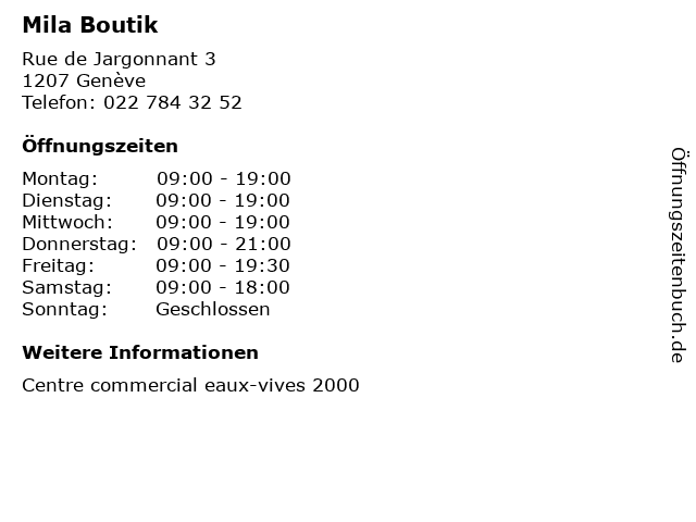 | Öffnungszeiten Mila Boutik in Genève anzeigen | |