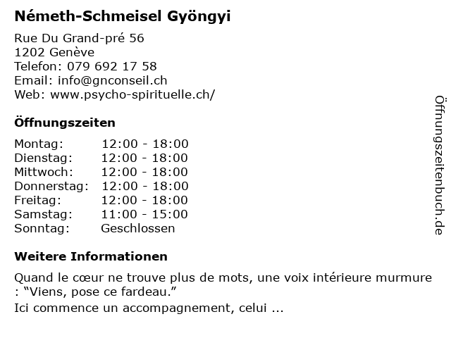 | Öffnungszeiten Németh-Schmeisel Gyöngyi in Genève anzeigen | |