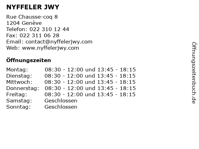 | Öffnungszeiten NYFFELER JWY in Genève anzeigen | |
