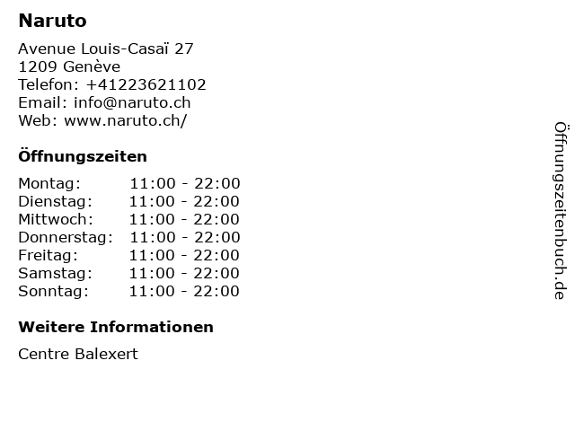 | Öffnungszeiten Naruto in Genève anzeigen | |