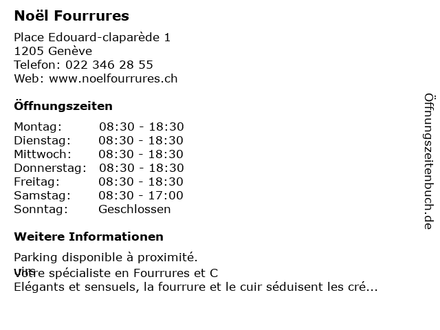 | Öffnungszeiten Noël Fourrures in Genève anzeigen | |