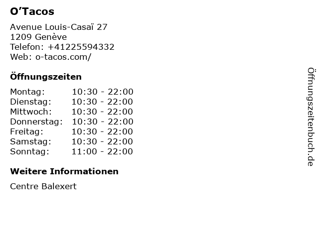 | Öffnungszeiten O’Tacos in Genève anzeigen | |