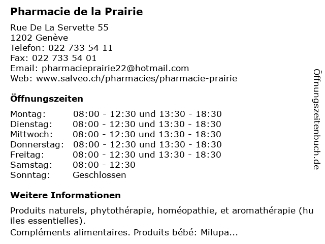 | Öffnungszeiten Pharmacie de la Prairie in Genève anzeigen | |