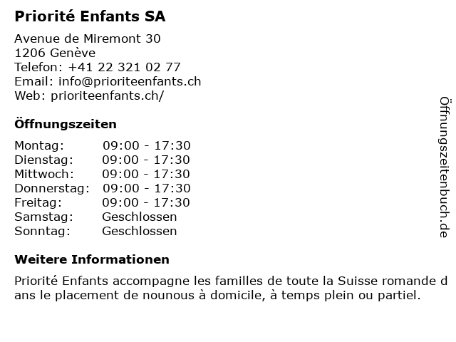 | Öffnungszeiten Priorité Enfants SA in Genève anzeigen | |