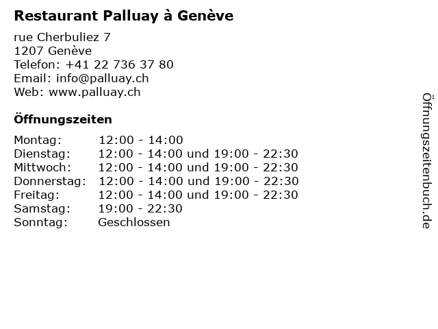 | Öffnungszeiten Restaurant Palluay à Genève in Genève anzeigen | |