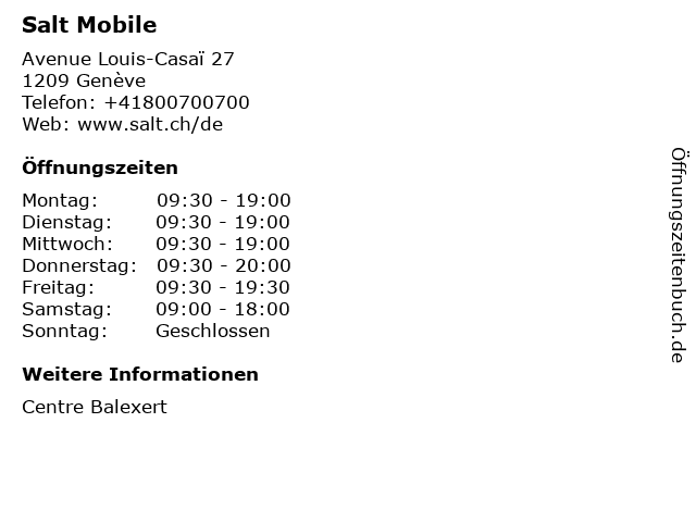 | Öffnungszeiten Salt Mobile in Genève anzeigen | |