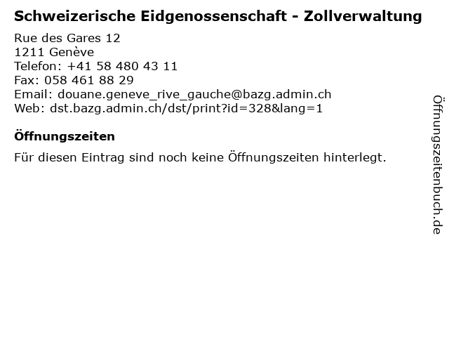 1 Schweizerische Eidgenossenschaft - Zollverwaltung (Entfernung: 3,03 km) Route du Grand-Lancy 6a, 1227 Les Acacias 2 Schweizerische Eidgenossenschaft - Zollverwaltung (Entfernung: 3,37 km) Route de l’aéroport 21, 1215 Genève 3 Schweizerische Eidgenossenschaft - Zollverwaltung (Entfernung: 5,24 km) Route Blanche 24, 1226 Thônex 4 Schweizerische Eidgenossenschaft - Zollverwaltung (Entfernung: 5,38 km) Rue de Genève 154, 1226 Thônex 5 Schweizerische Eidgenossenschaft - Zollverwaltung (Entfernung: 6,37 km) Route de Mon-idée 4, 1226 Thônex 6 Schweizerische Eidgenossenschaft - Zollverwaltung (Entfernung: 7,51 km) Route de Meyrin 399, 1217 Meyrin |