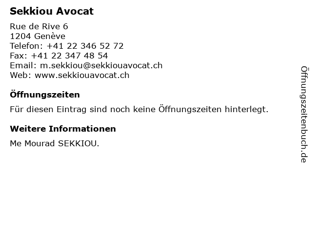 | Öffnungszeiten Sekkiou Avocat in Genève anzeigen | |