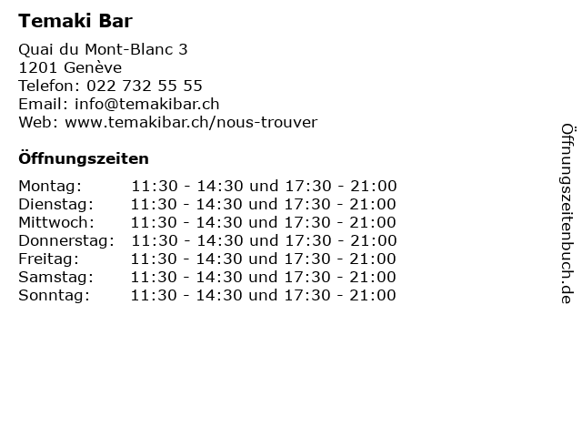 | Öffnungszeiten Temaki Bar in Genève anzeigen | |