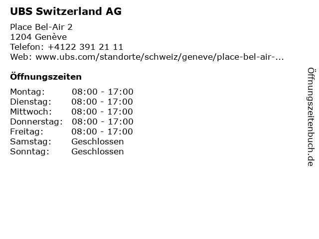 | Öffnungszeiten UBS Switzerland AG in Genève anzeigen | |