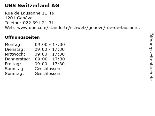 | Öffnungszeiten UBS Switzerland AG in Genève anzeigen | |