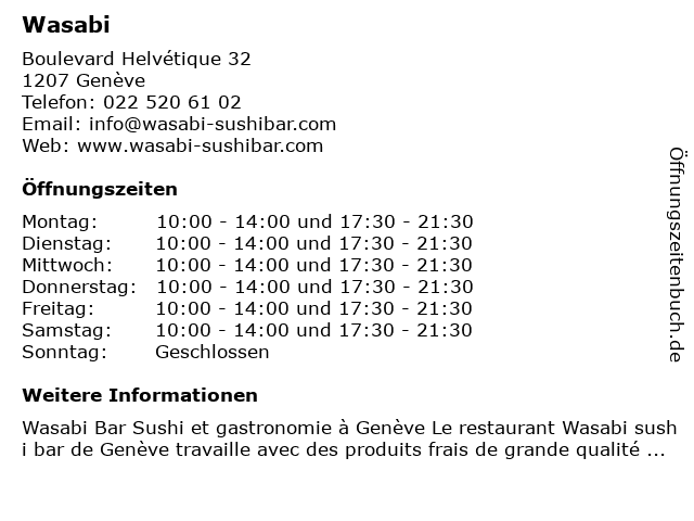 | Öffnungszeiten Wasabi in Genève anzeigen | |