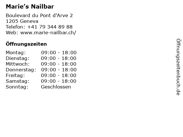 | Öffnungszeiten Marie’s Nailbar in Geneva anzeigen | |