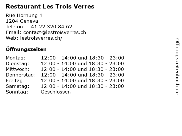 | Öffnungszeiten Restaurant Les Trois Verres in Geneva anzeigen | |