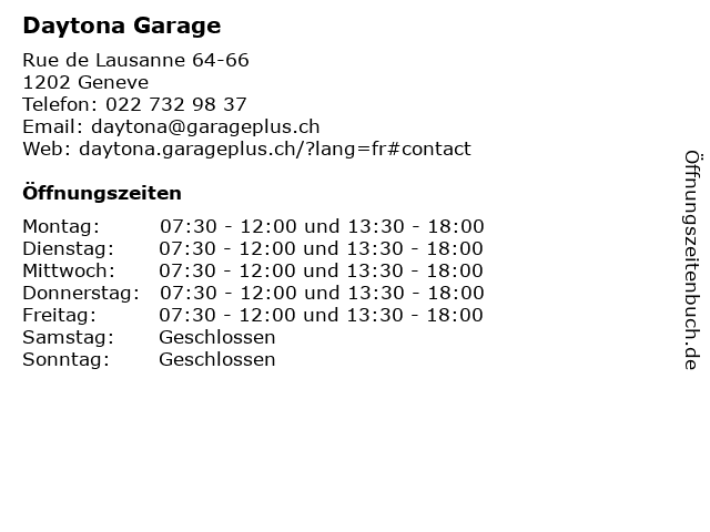 | Öffnungszeiten Daytona Garage in Geneve anzeigen | |