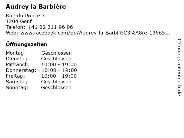 | Öffnungszeiten Audrey la Barbière in Genf anzeigen | |