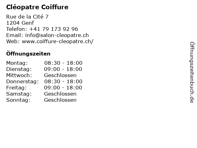| Öffnungszeiten Cléopatre Coiffure in Genf anzeigen | |