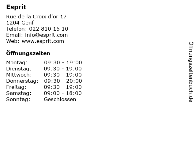 | Öffnungszeiten Esprit in Genf anzeigen | |