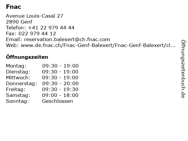 | Öffnungszeiten Fnac in Genf anzeigen | |