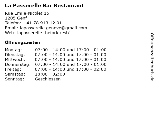 | Öffnungszeiten La Passerelle Bar Restaurant in Genf anzeigen | |