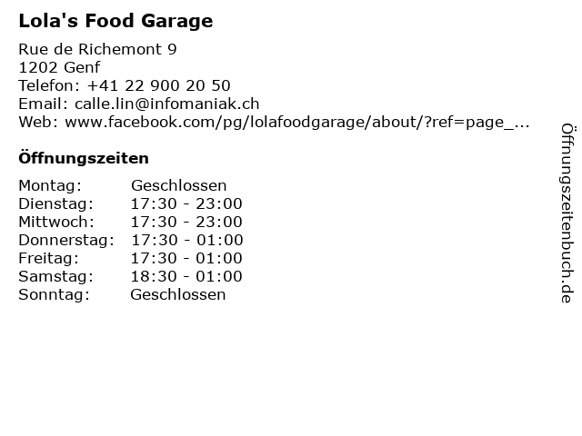 | Öffnungszeiten Lola's Food Garage in Genf anzeigen | |