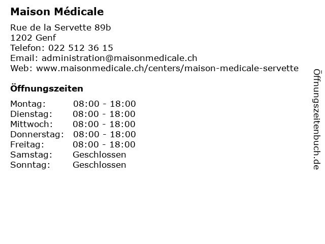 | Öffnungszeiten Maison Médicale in Genf anzeigen | |
