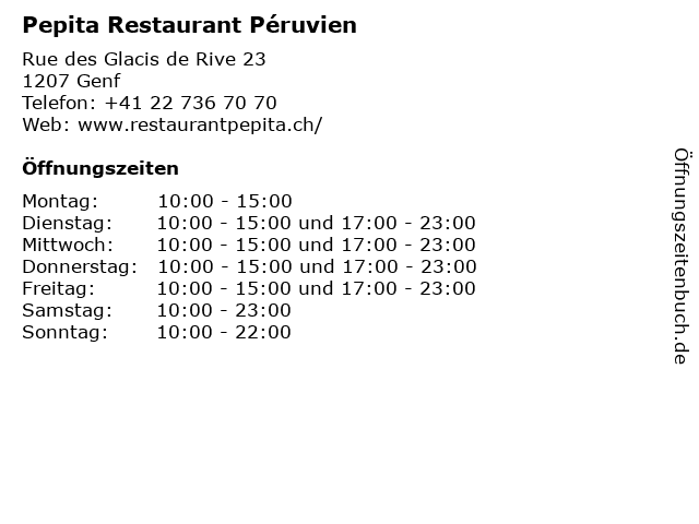 | Öffnungszeiten Pepita Restaurant Péruvien in Genf anzeigen | |