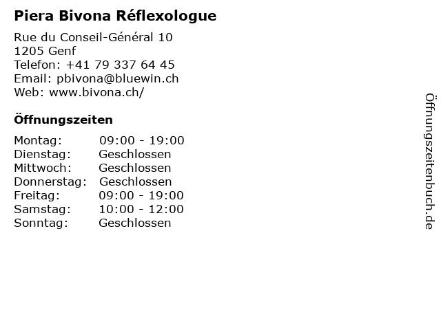 | Öffnungszeiten Piera Bivona Réflexologue in Genf anzeigen | |