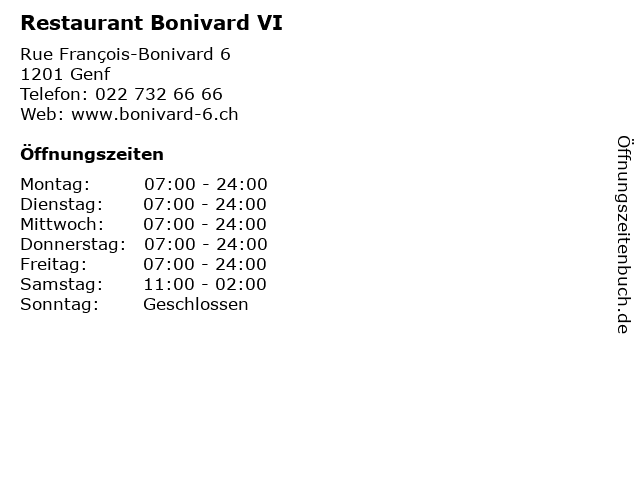 | Öffnungszeiten Restaurant Bonivard VI in Genf anzeigen | |