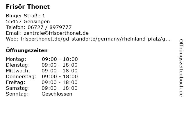 | Öffnungszeiten Frisör Thonet in Gensingen anzeigen | |