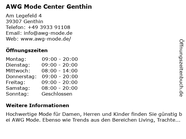 | Öffnungszeiten AWG Mode Center Genthin in Genthin anzeigen | |