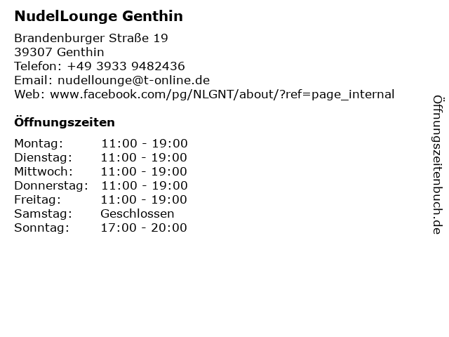 | Öffnungszeiten NudelLounge Genthin in Genthin anzeigen | |