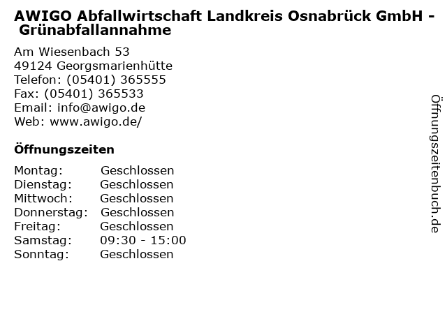 Branchen & Suchbegriffe zu AWIGO Abfallwirtschaft Landkreis Osnabrück GmbH - Grünabfallannahme:abfall, abfallwirtschaft, awigo, beachten:, bis, bitte, danke., dezember, entsorgung, februar, geöffnet, grünabfallannahme, grünplatz, landkreis, monat, nur, recycling, samstag, wertstoffe |