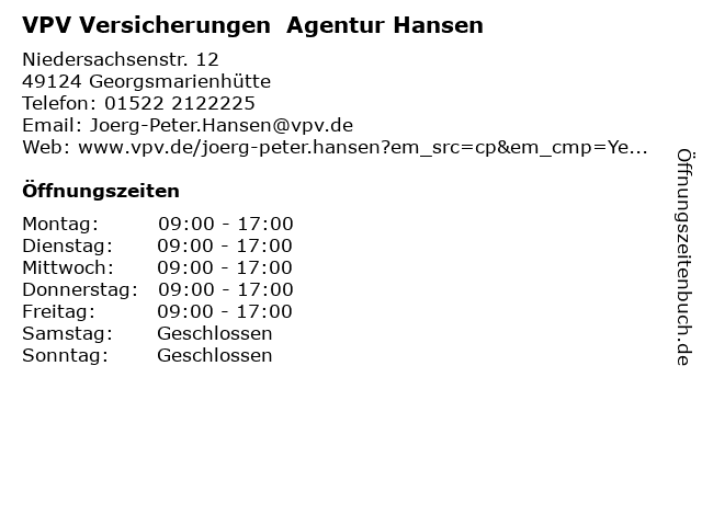 1 VPV Versicherungen Ivonne Weimer - GESCHLOSSEN (Entfernung: 0,01 km) Niedersachsenstr. 12, 49124 Georgsmarienhütte 4 SIGNAL IDUNA - Servicebüro Jörg-Peter Hansen und Christoph Reinecke (Entfernung: 3,16 km) Iburger Straße 225, 49082 Osnabrück 6 |