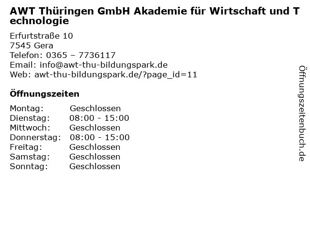 Branchen & Suchbegriffe zu AWT Thüringen GmbH Akademie für Wirtschaft und Technologie:akademie, ausbildung, awt, förderung, integration, kurse, lehrgänge, technologie, thüringen, wirtschaft |